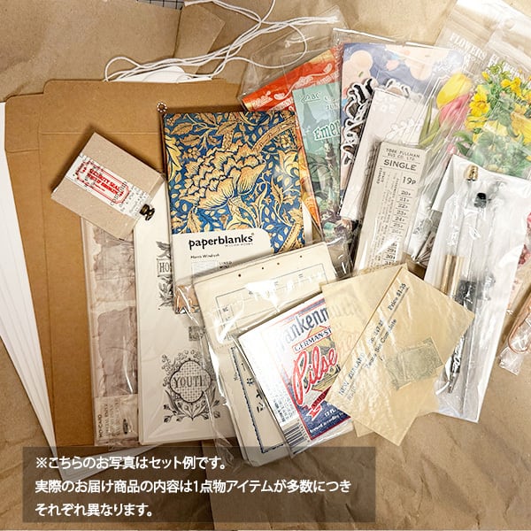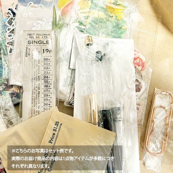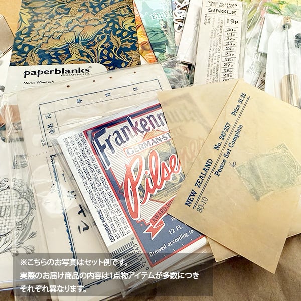 ※ 1点1点アンティークの紙もの、ランダムなシール商品などを詰め合わせているので、写真と同じ素材が届くものではございません。ランダム封入になりますので、オンリーワンの紙ものをお楽しみいただくボックス・セットになっています。